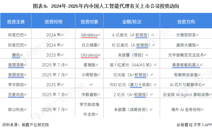 2024-2025年,中国人工智能代理企业投资聚焦具身智能、算力基建及垂直场景应用,头部企业与资本密集布局。阿里宣布未来三年投入3800亿元用于AI基础设施,领投MiniMax(6亿美元A轮)、月之暗面(10亿美元A轮)等大模型初创公司;腾讯以“资本+生态”模式领投英国触觉技术公司Ultraleap,资本开支计划1070亿元强化算力与大模型研发;美团通过龙珠资本密集押注具身智能,接连领投星海图(超1亿美元A4/A5轮)、小雨智造(亿元级A+轮);字节跳动斥资900亿元采购AI算力卡,同步布局AI芯片与数据中心建设;百度则通过开源文心大模型4.5吸引生态投资,智能云业务获央企及地方政府订单超50亿元。此外,中数睿智、岩山科技等企业在2025年7月分别获得2亿元A+轮融资及字节跳动海外主体战略投资,凸显资本对B端AI Agent及全球化布局的关注。